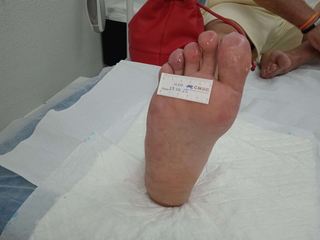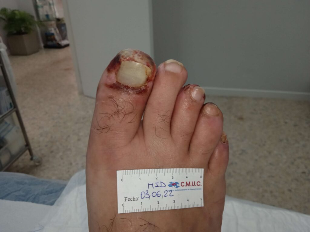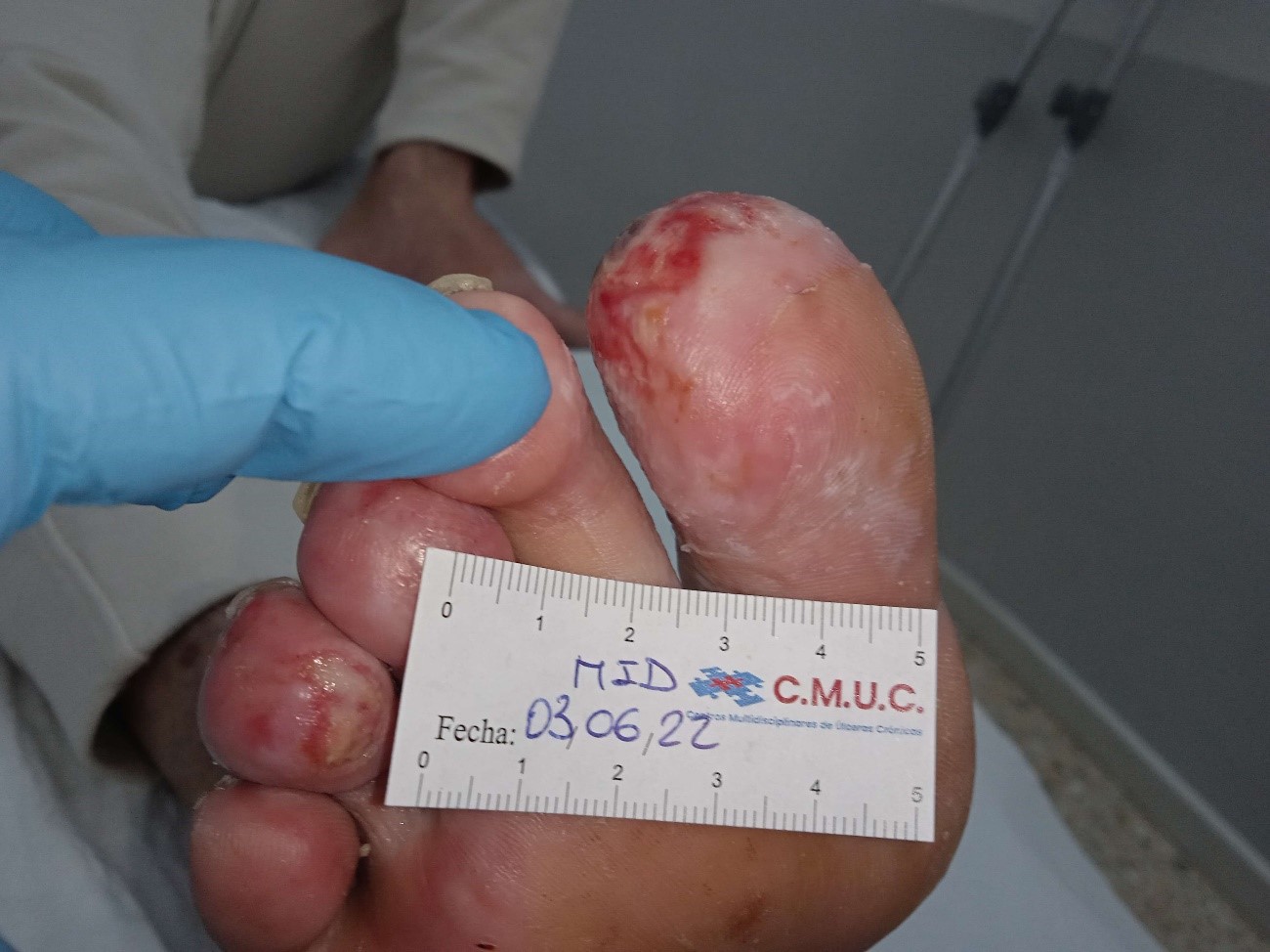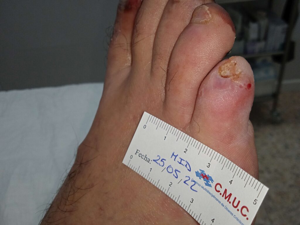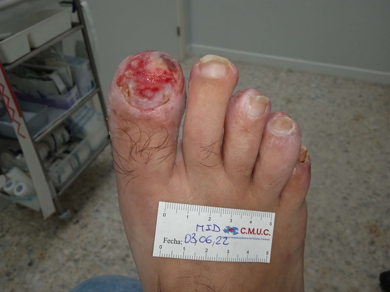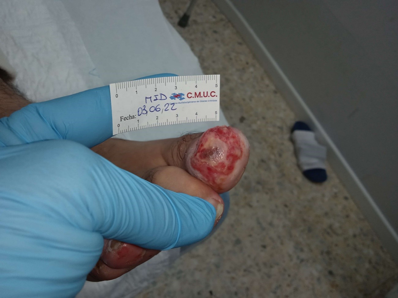 El paciente ha realizado curas por su cuenta y ha vuelto a acudir a consulta 8 días más tarde y es esto lo que nos encontramos.