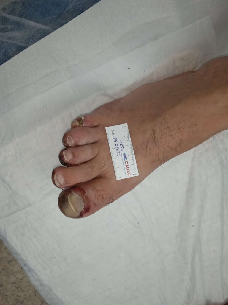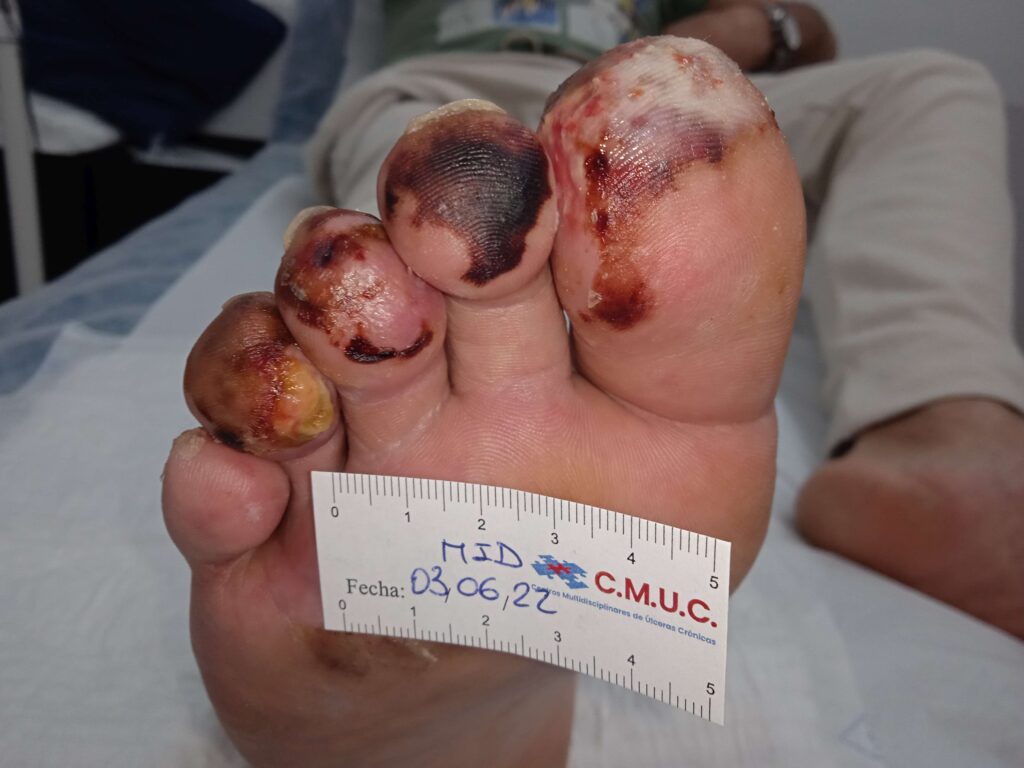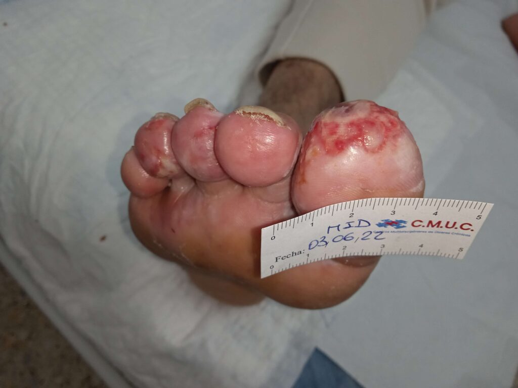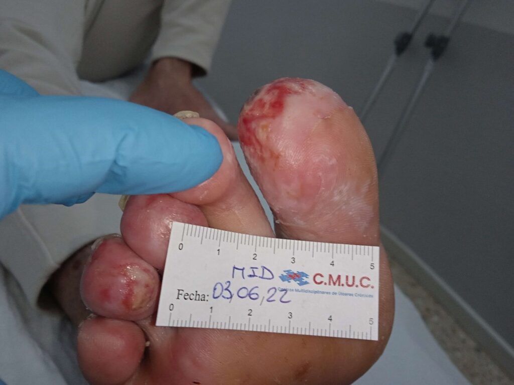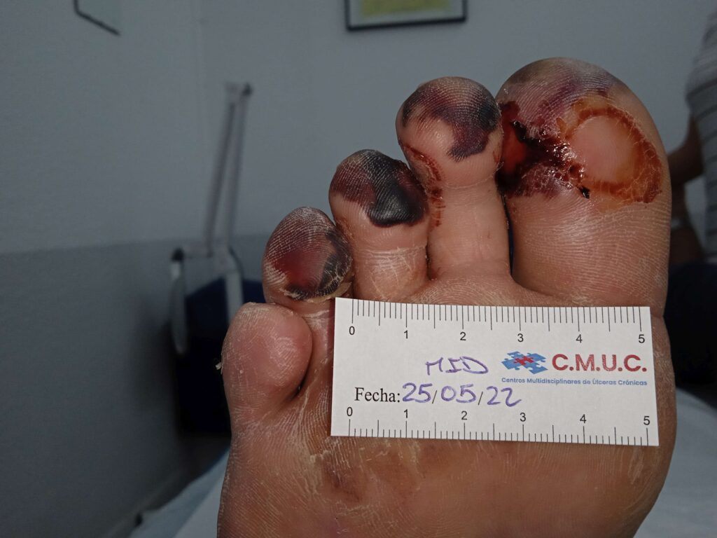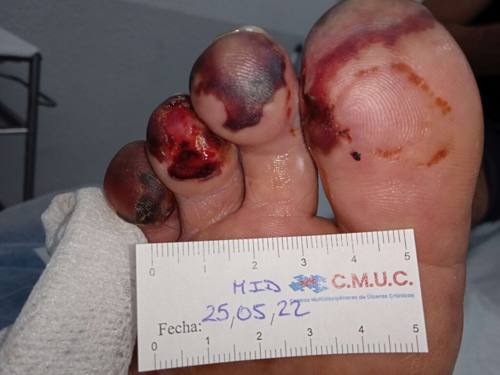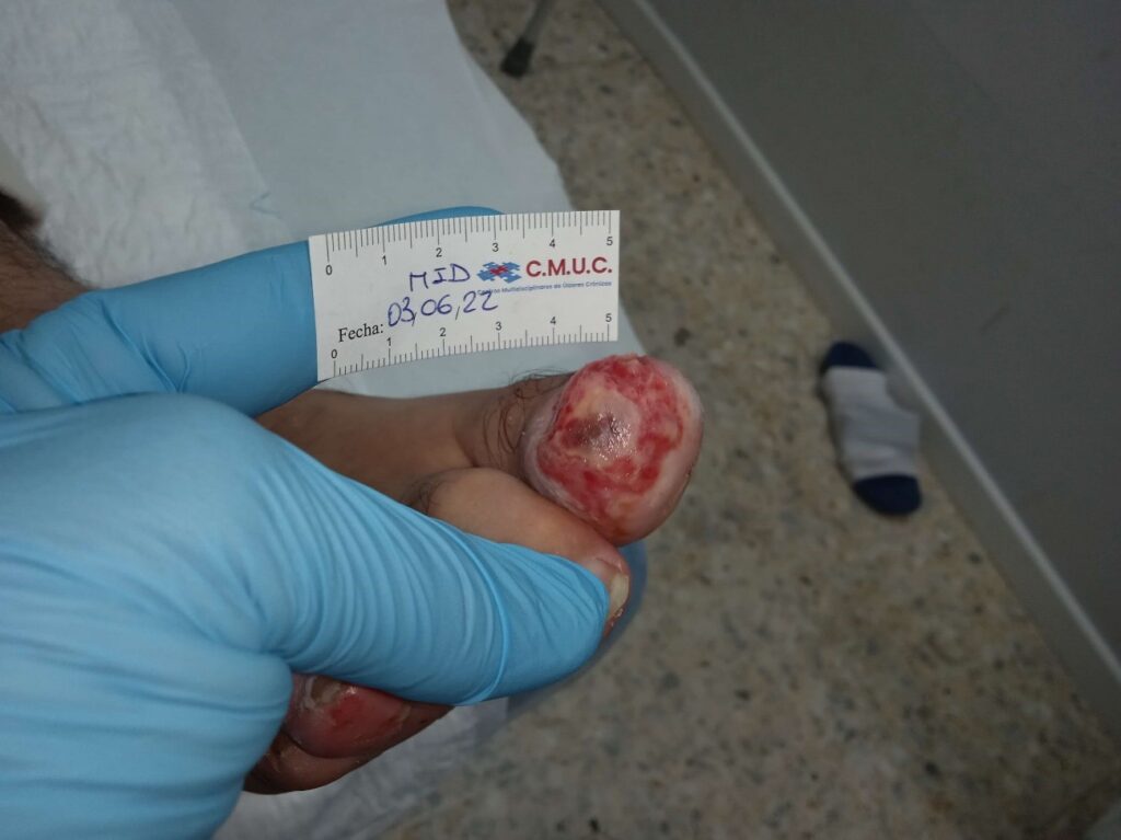 En un primer momento solo es posible desbridar el 5 dedo del paciente debido al dolor sensitivo y el miedo a poder sufrir que padece.