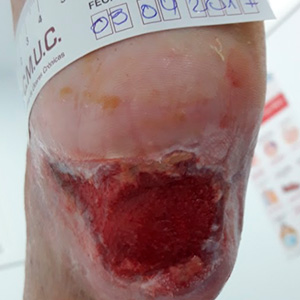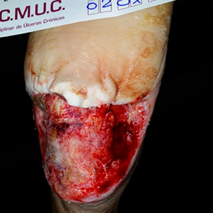 Paciente, mujer de 68 años edadindependiente en AVD. Acude a clínica con úlcera de 3 meses de evolución producida por grieta y cuerpos extraños, tratada con apósitos de cura húmeda y ATB oral. Pronóstico malo y le proponen amputación de la pierna.