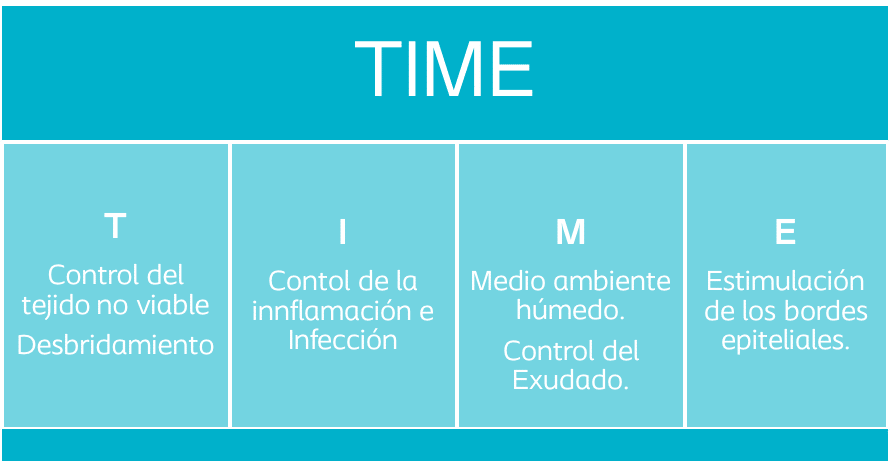 El objetivo del esquema TIME es optimizar el lecho de la herida mediante la reducción del edema, el exudado y la carga bacteriana y de forma no menos importante, mediante la corrección de anomalías que retrasan la cicatrización.