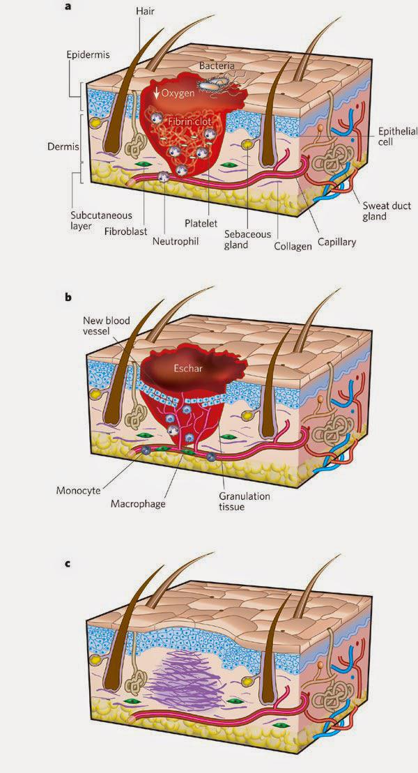 • Fase inflamatoria: comienza inmediatamente. Después de la ruptura de los vasos un coágulo cubre la herida y forma una matriz extracelular compuesta de fibrina y fibronectina que sella la herida y reduce al mínimo la pérdida de sangre. Las plaquetas secretan y activan mediadores para reclutar células inflamatorias, fibroblastos y células endoteliales. El sangrado se controla al final de la fase inflamatoria y el lecho de la herida se limpia a través de la fagocitosis.