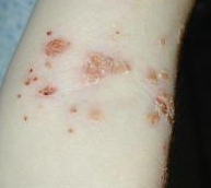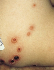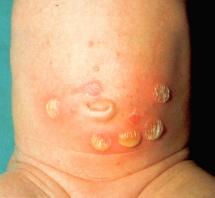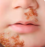 Esta infección causa lesiones en la piel tipo ampollas o lesiones costrosas en general en en la zona de boca y nariz, brazos y piernas, aunque puede surgir en cualquier parte.