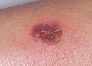 2.1 Impétigo no ampolloso o con costras, es el más común y se manifiesta iniciando como pequeñas ampollas o comedón (como una espinilla) que revientan y dejan pequeñas áreas húmedas de piel roja que supuran líquido, para posteriormente formar una costra que puede tener diferente color.