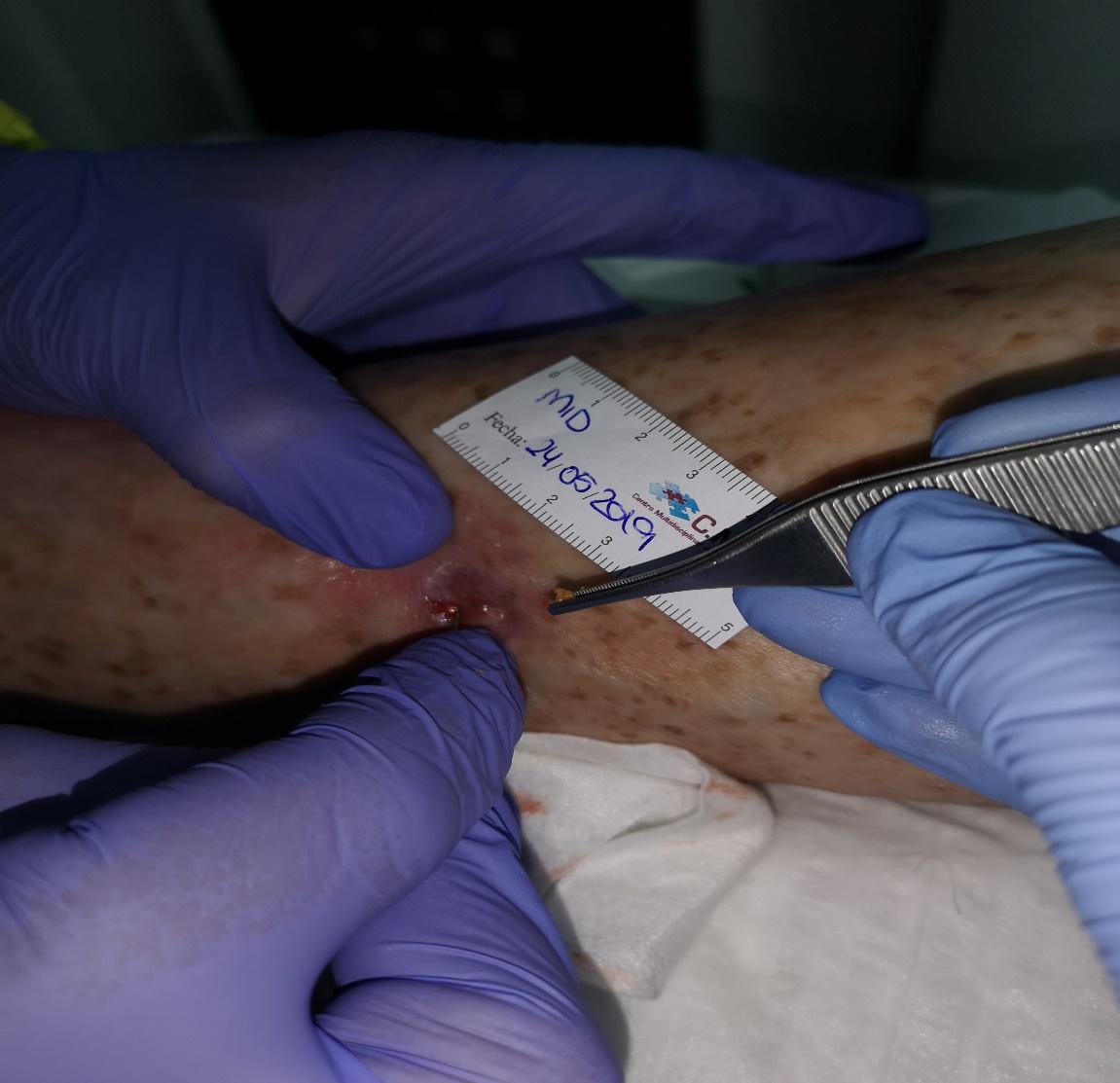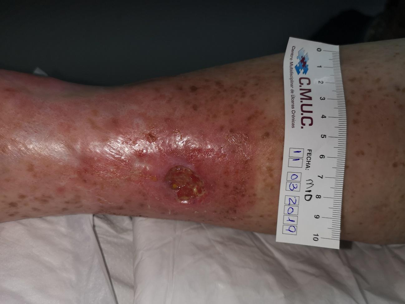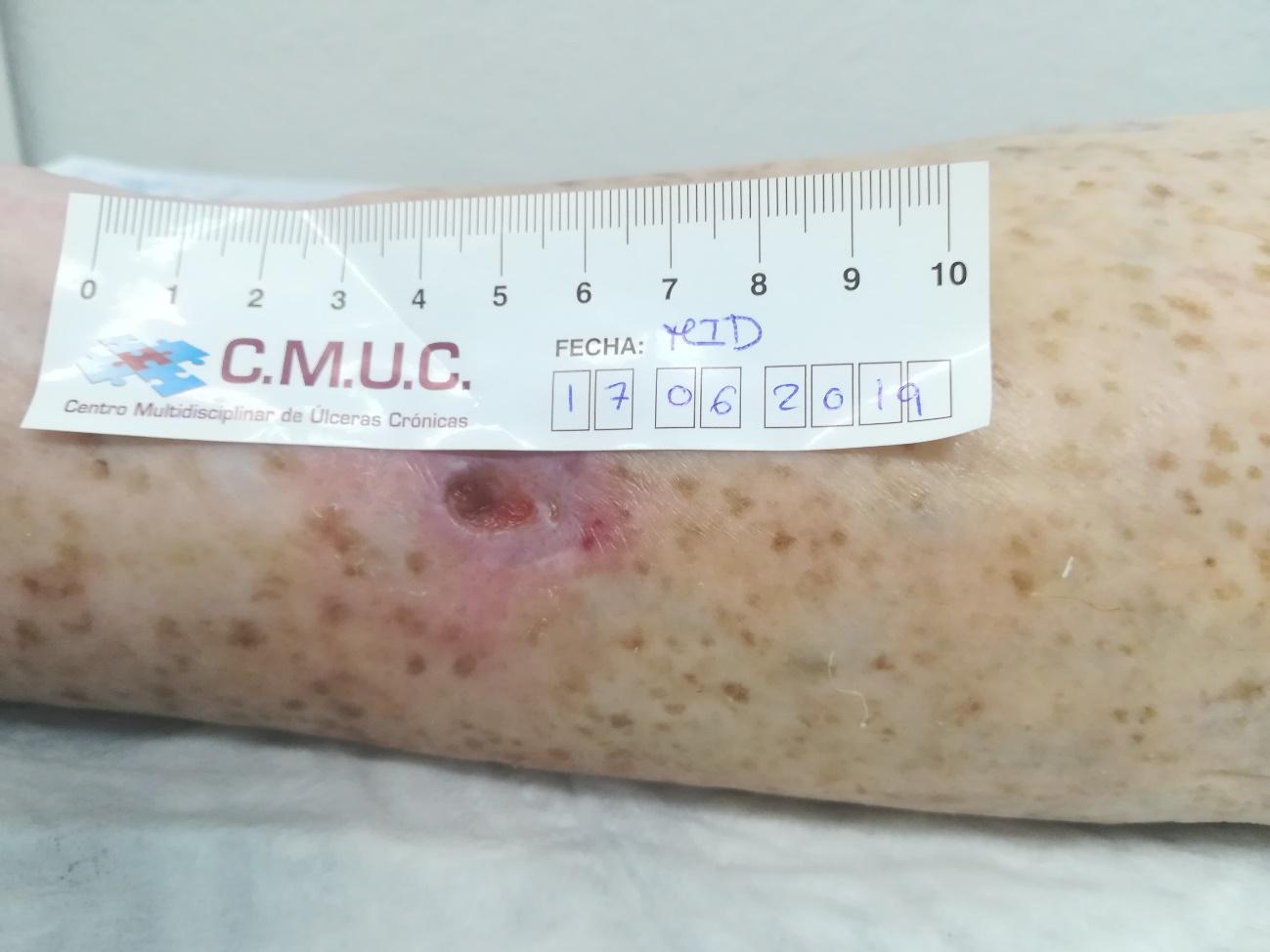 Actualmente, la herida evoluciona a la perfección y no se palpan más calcificaciones. Está pendiente de epitelizar y que se lleve a cabo un estudio por el equipo de cirugía vascular y/o dermatología.